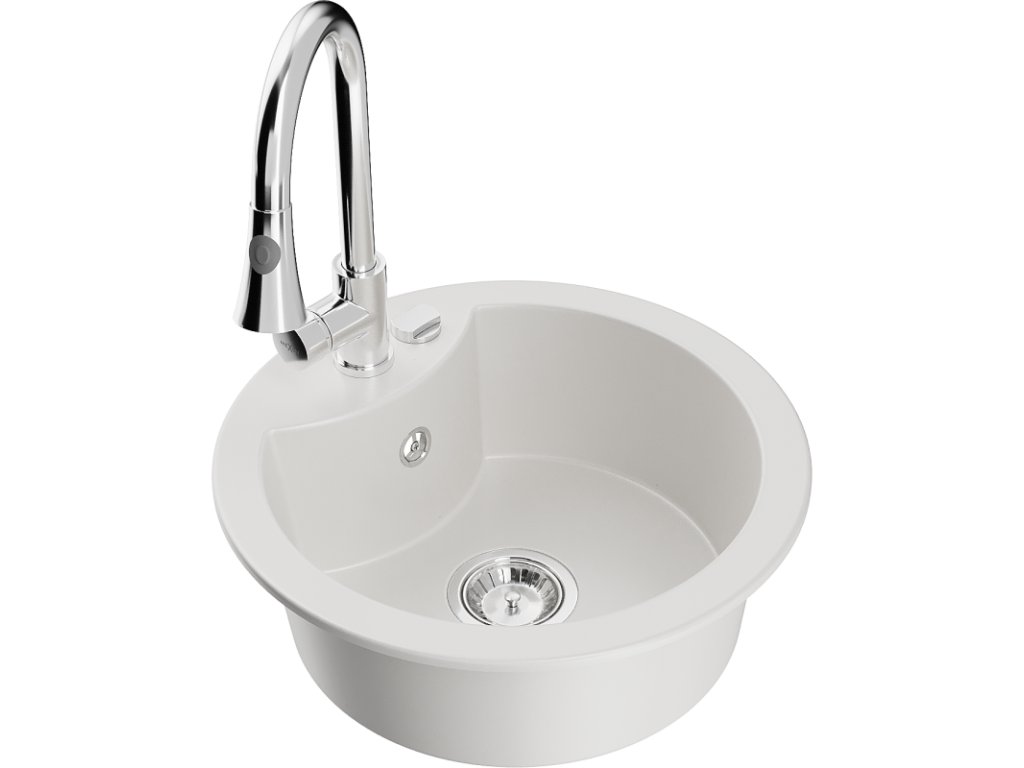 Granitový drez Mexen Diego s 1 misou a kuchynskou batériou Elia, biely - 6512-20-670101-00