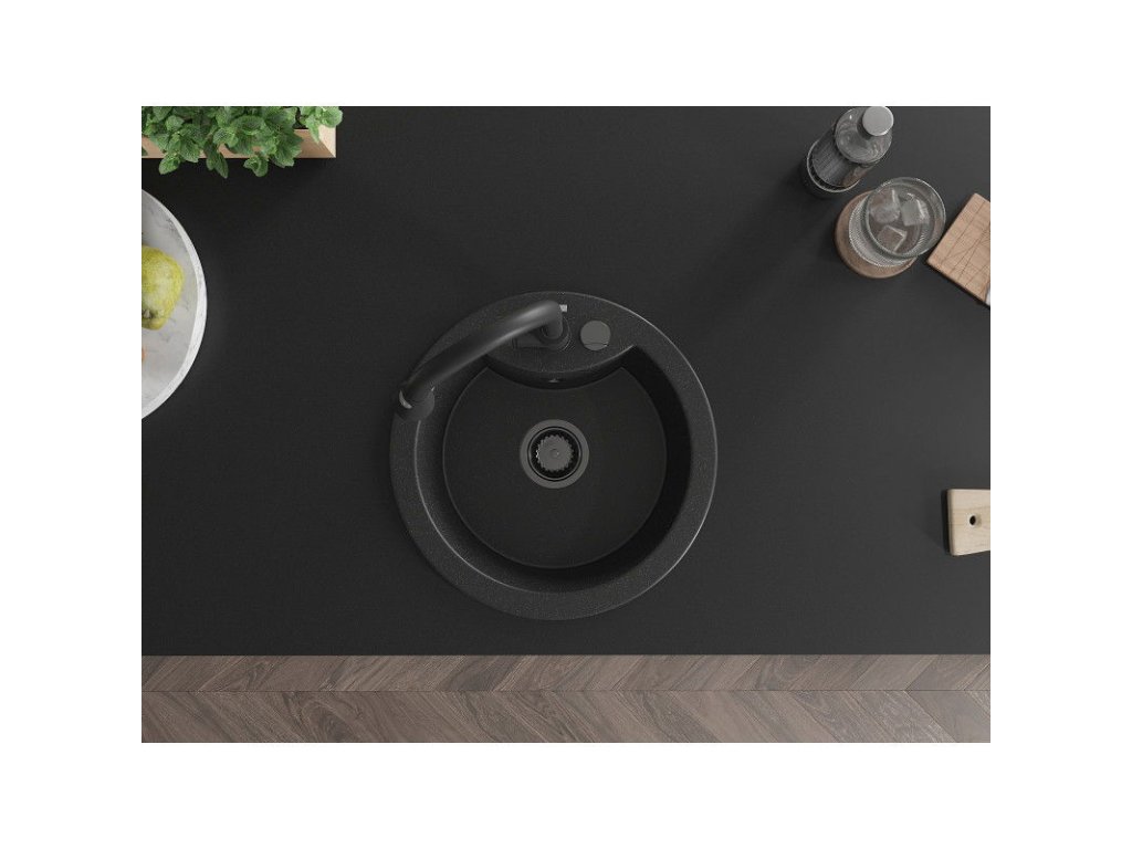 Granitový drez Mexen Diego s 1 misou a kuchynskou batériou Elia, čierna/strieborná metalíza - 6512-73-670101-70-B