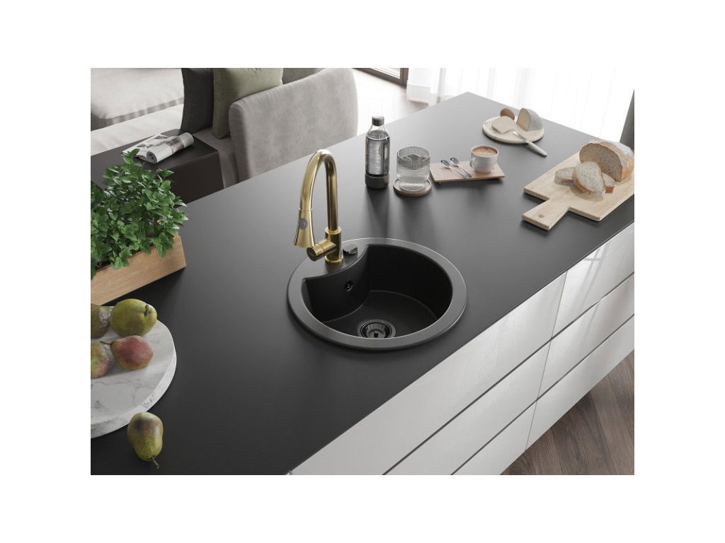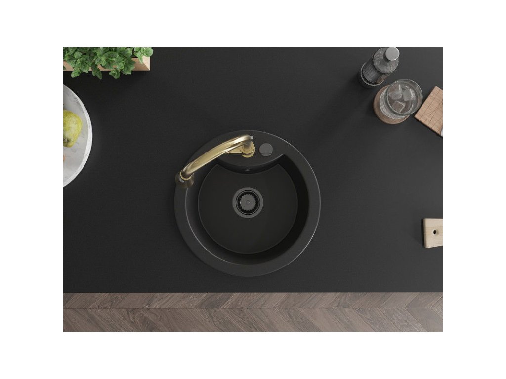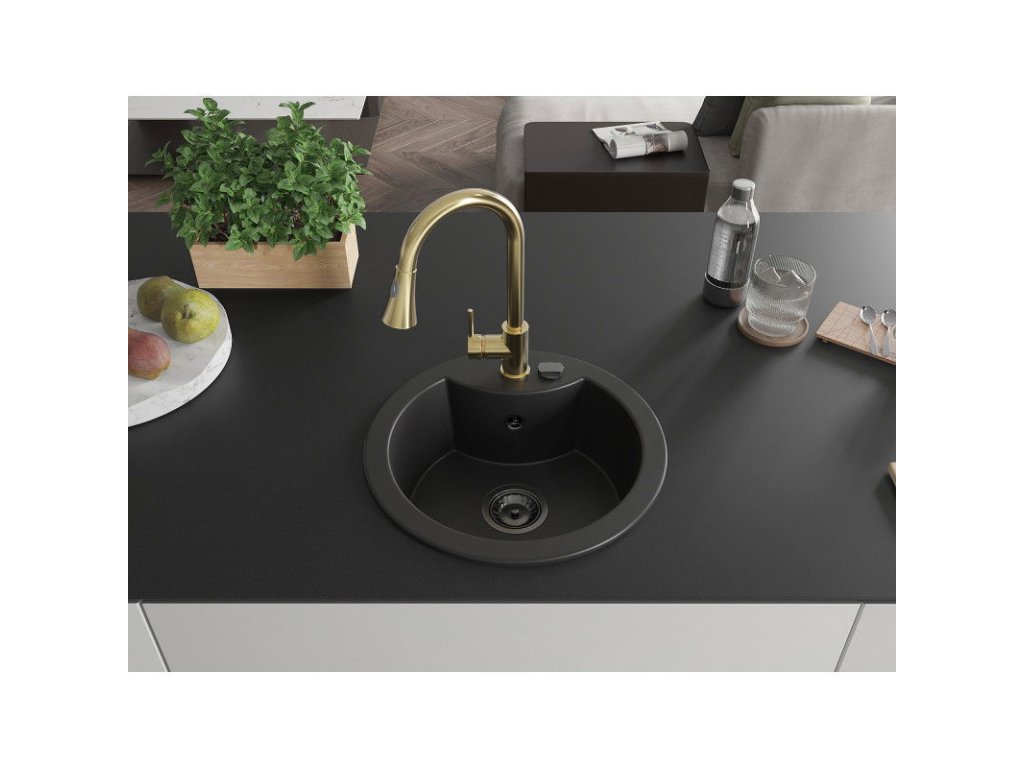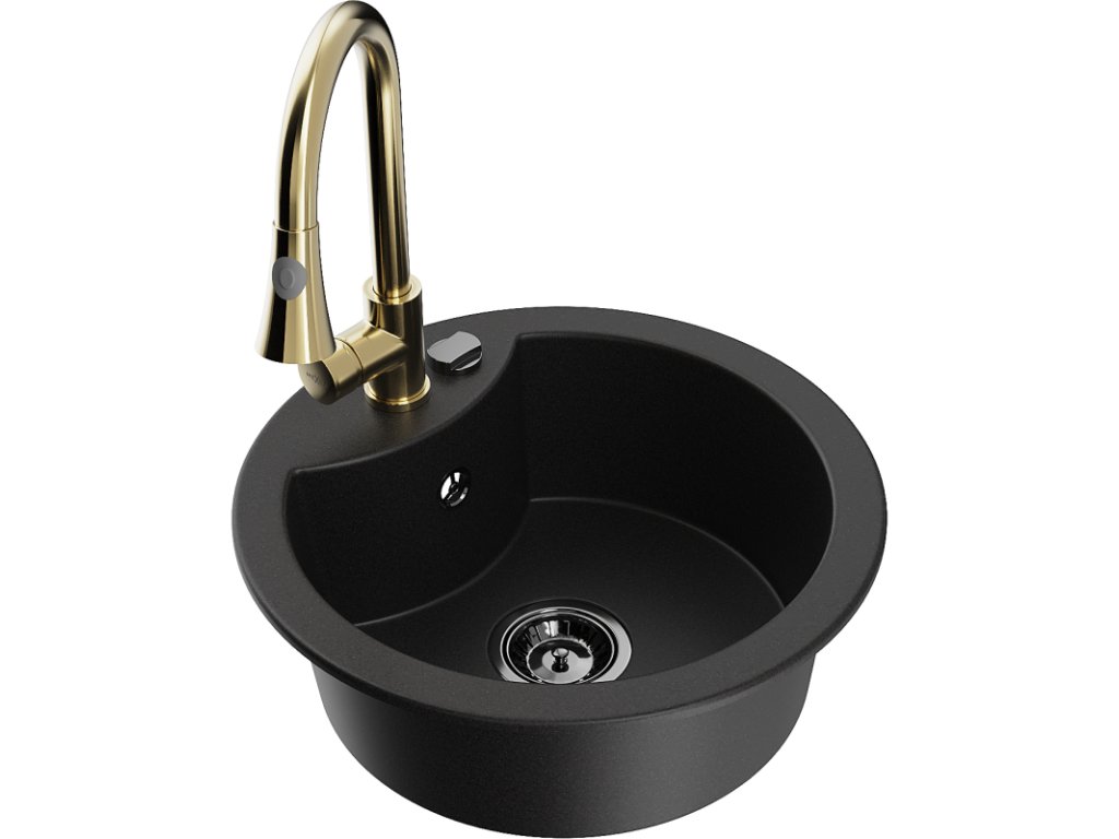 Granitový drez Mexen Diego s 1 misou a kuchynskou batériou Elia, čierny - 6512-77-670101-50-B