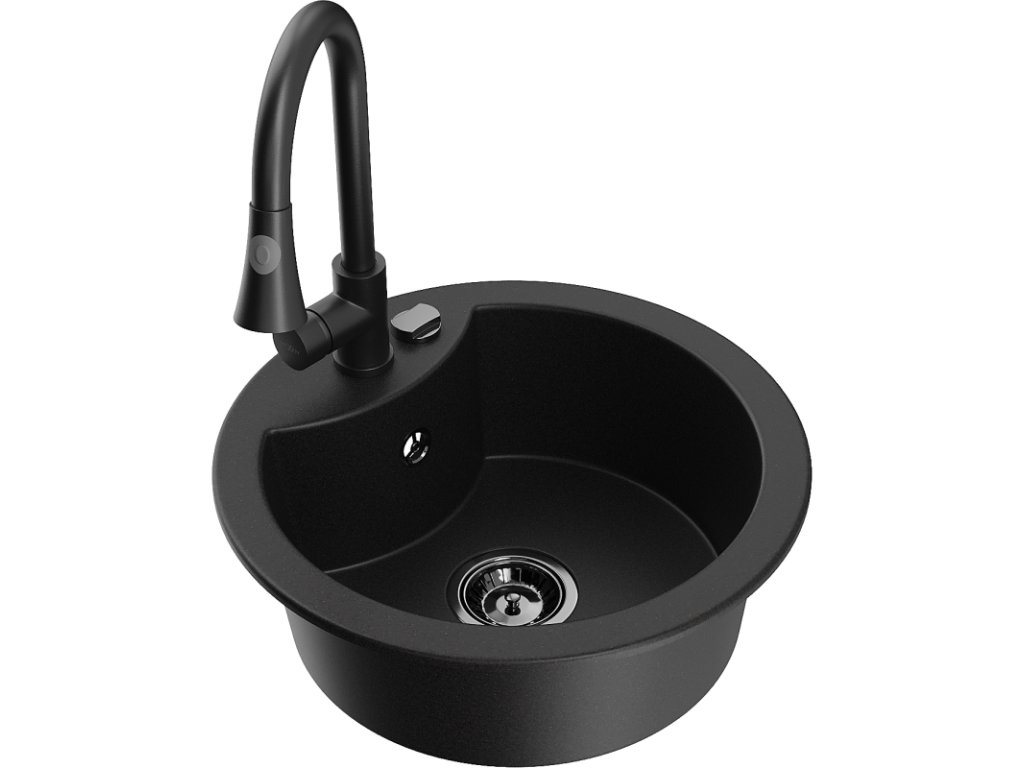 Granitový drez Mexen Diego s 1 misou a kuchynskou batériou Elia, čierny - 6512-77-670101-70-B