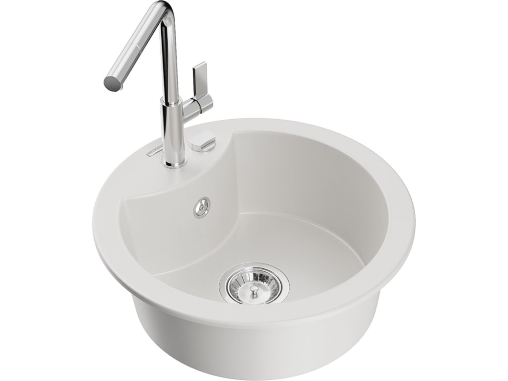 Granitový drez Mexen Diego s 1 misou a kuchynskou batériou Flora, biely - 6512-20-670401-00