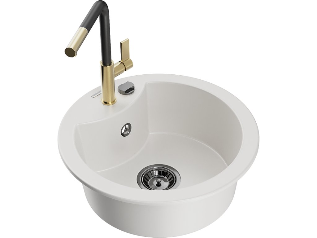 Granitový drez Mexen Diego s 1 misou a kuchynskou batériou Flora, biely - 6512-20-670401-57-B