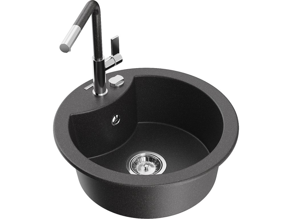 Granitový drez Mexen Diego s 1 misou a kuchynskou batériou Flora, čierna škvrnitá - 6512-76-670401-08