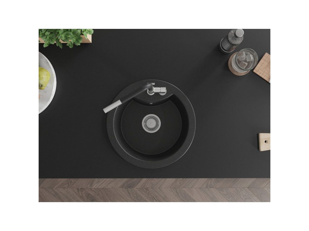 Granitový drez Mexen Diego s 1 misou a kuchynskou batériou Flora, čierna/strieborná metalíza - 6512-73-670401-07
