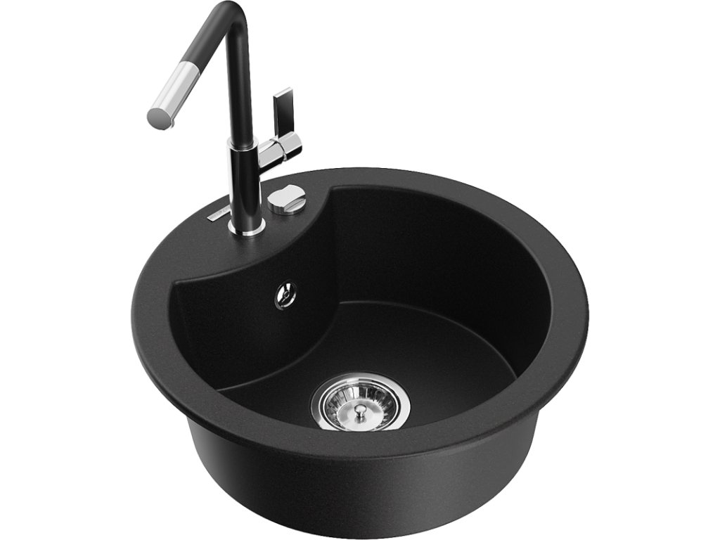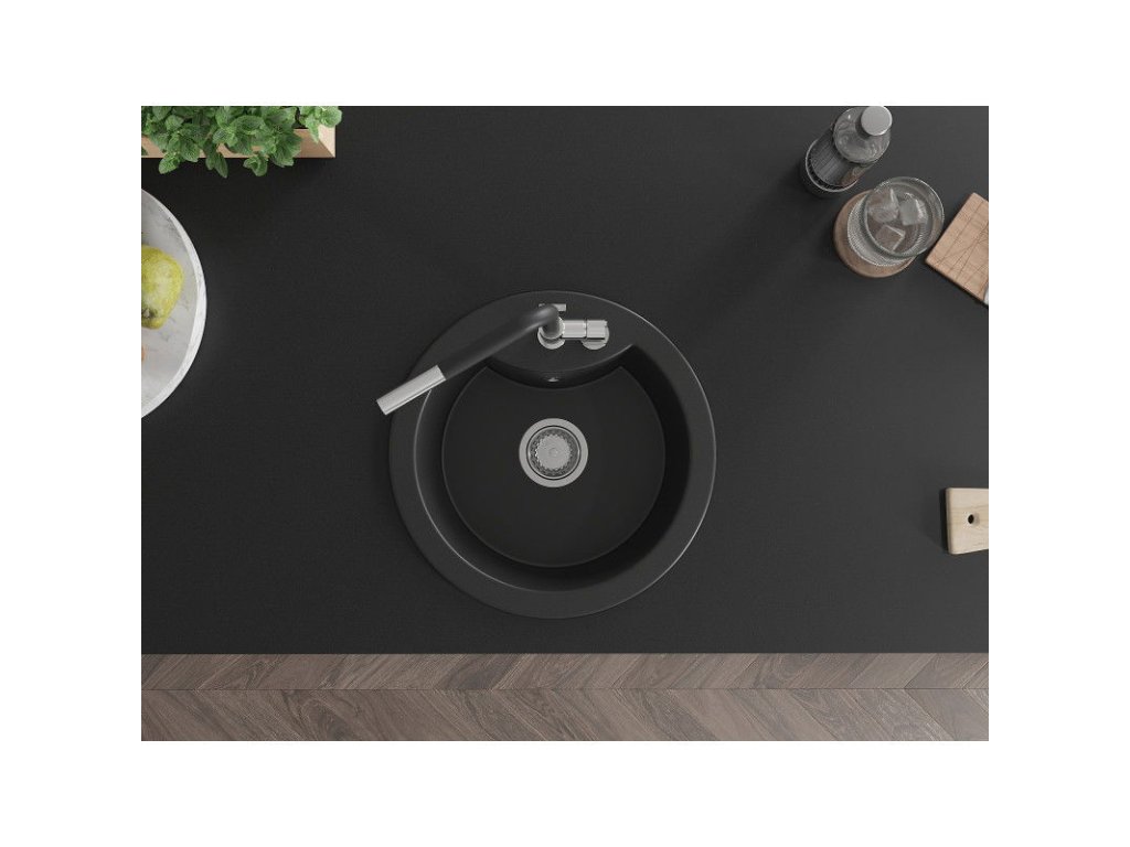 Granitový drez Mexen Diego s 1 misou a kuchynskou batériou Flora, čierny - 6512-77-670401-07