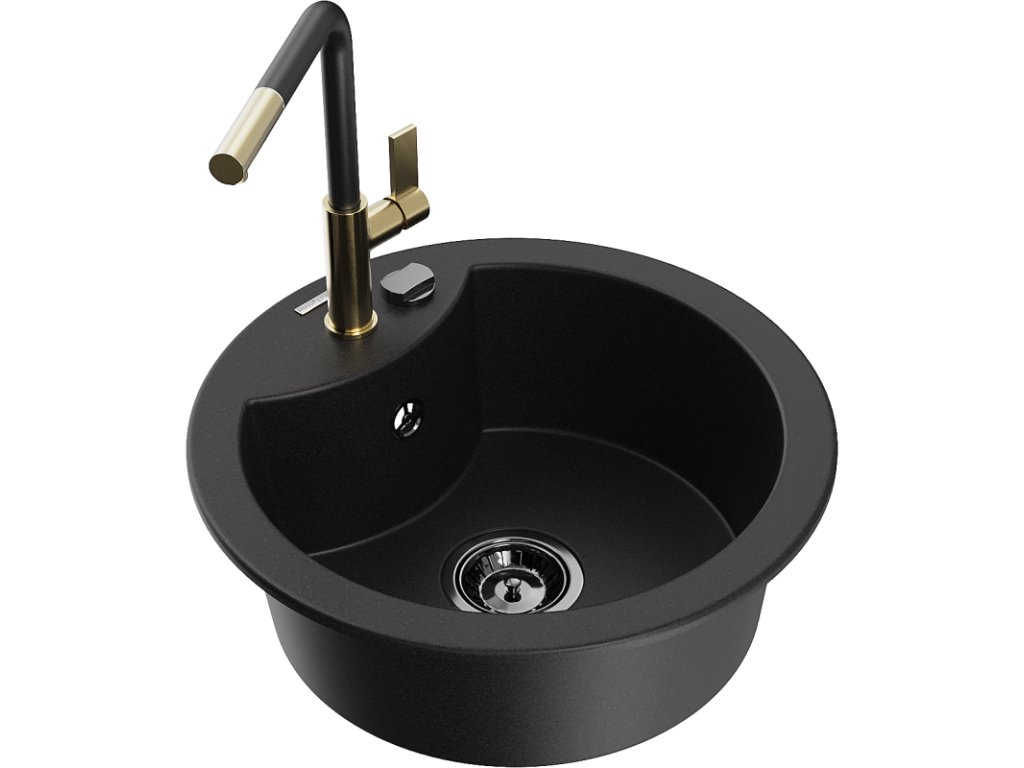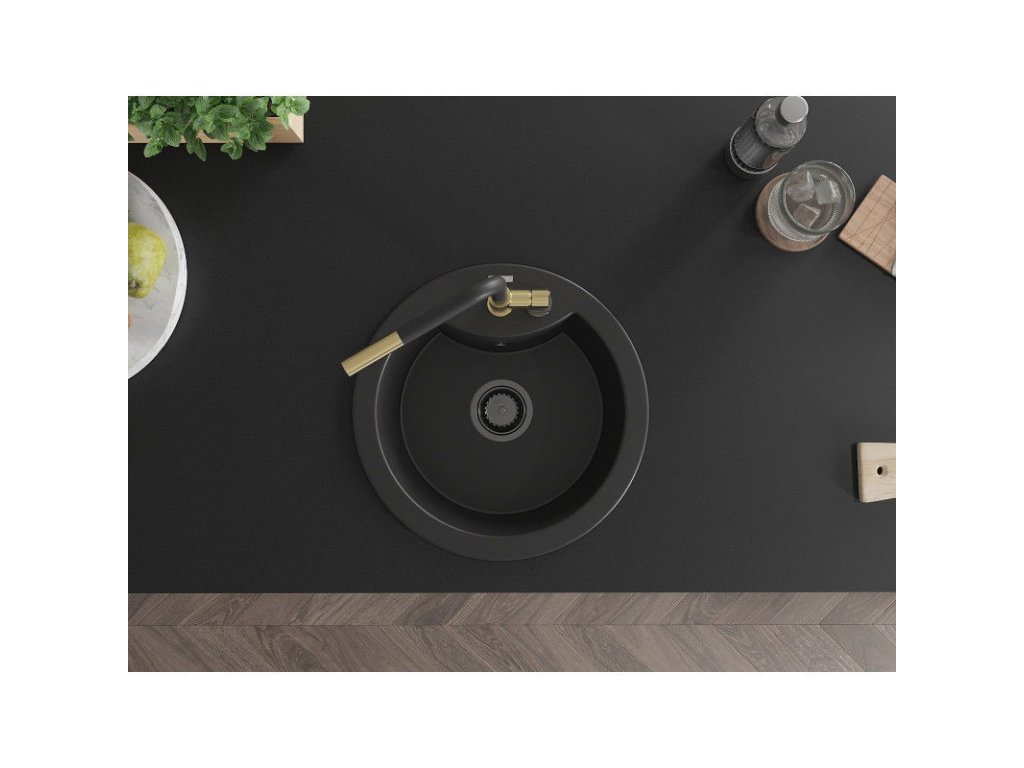 Granitový drez Mexen Diego s 1 misou a kuchynskou batériou Flora, čierny - 6512-77-670401-57-B