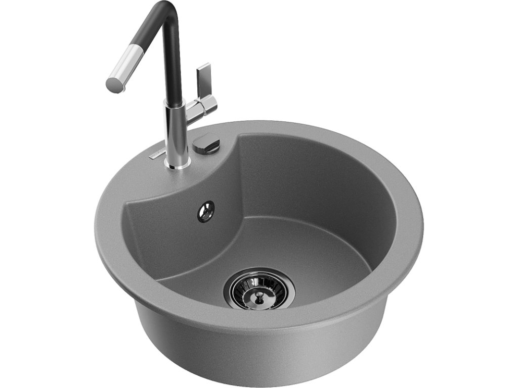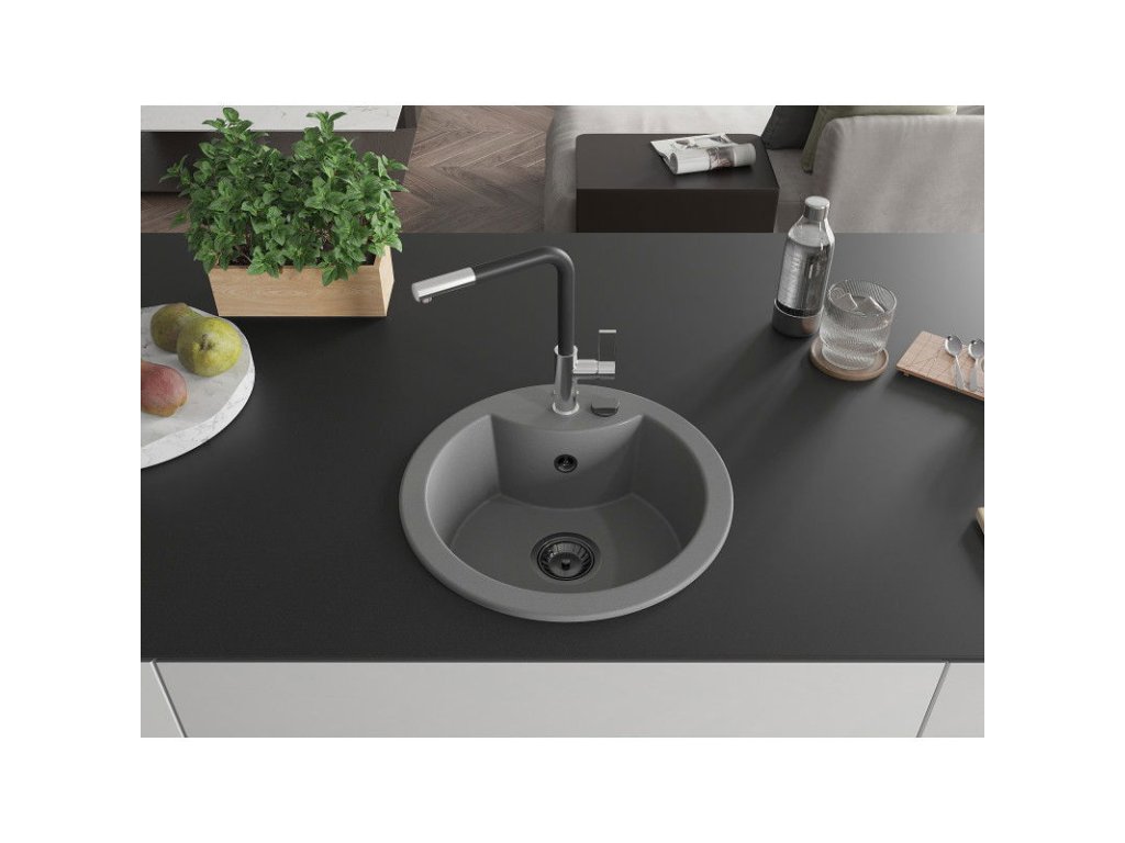 Granitový drez Mexen Diego s 1 misou a kuchynskou batériou Flora, sivý - 6512-71-670401-07-B