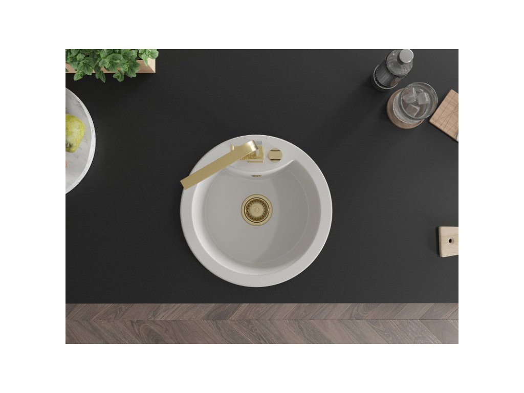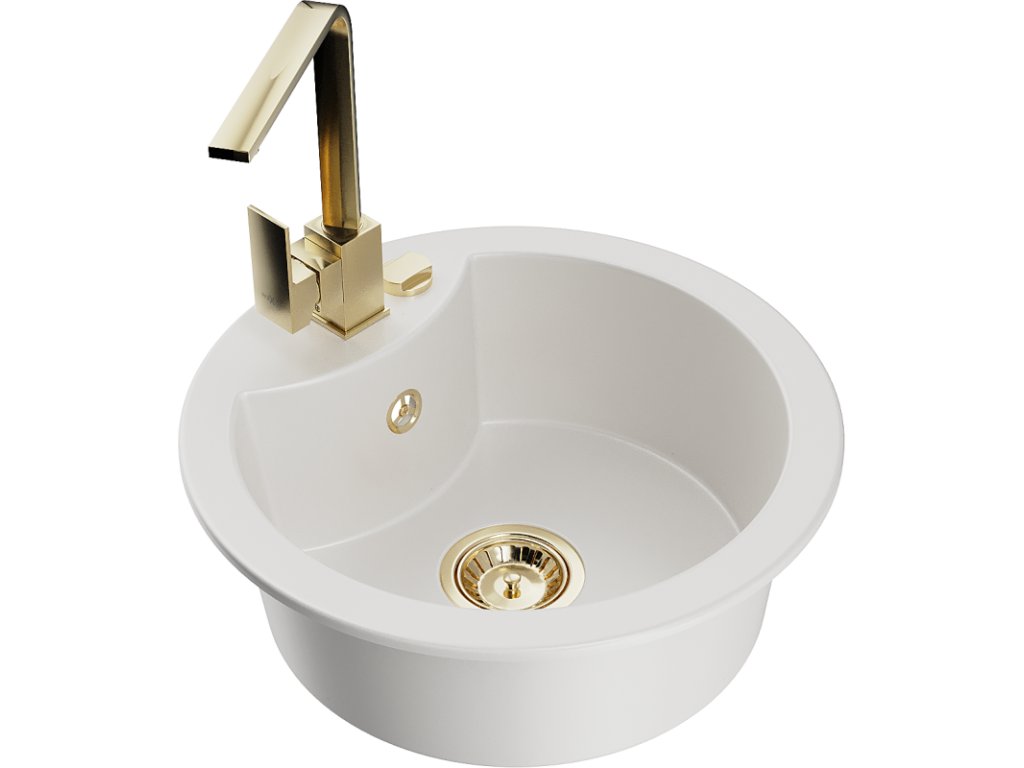 Granitový drez Mexen Diego s 1 misou a kuchynskou batériou Rita, biely - 6512-20-670300-50