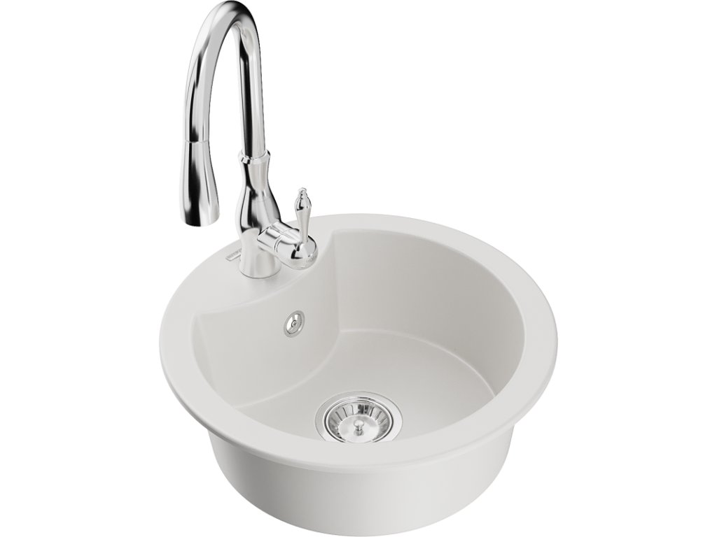 Granitový drez Mexen Diego s 1 misou a kuchynskou batériou Savita, biely - 6512-20-672601-00