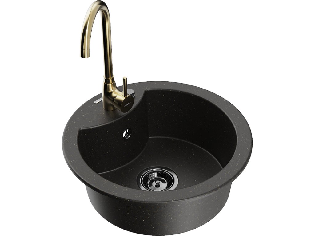 Granitový drez Mexen Diego s 1 misou a kuchynskou batériou Telma, čierna/zlatá - 6512-75-670200-50-B