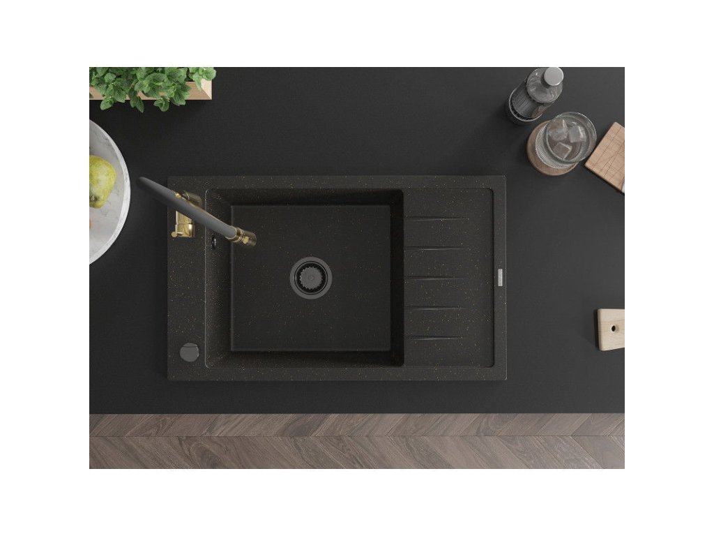 Granitový drez Mexen Elias s 1 misou, odkapávačom a batériou Aster, čierna/zlatá metalíza - 6511-75-73450-57-B