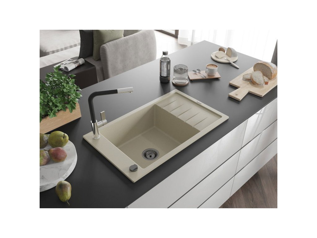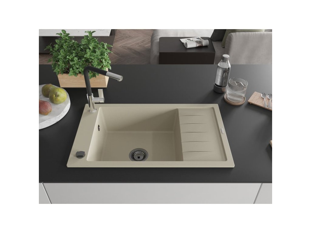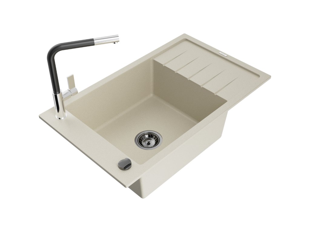 Granitový drez Mexen Elias s 1 misou, odkapávačom a batériou Flora, béžový - 6511-69-670401-07-B