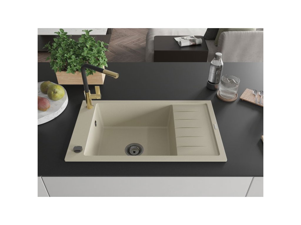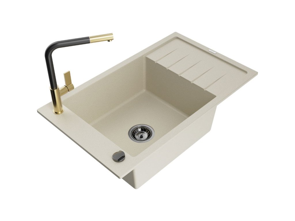 Granitový drez Mexen Elias s 1 misou, odkapávačom a batériou Flora, béžový - 6511-69-670401-57-B