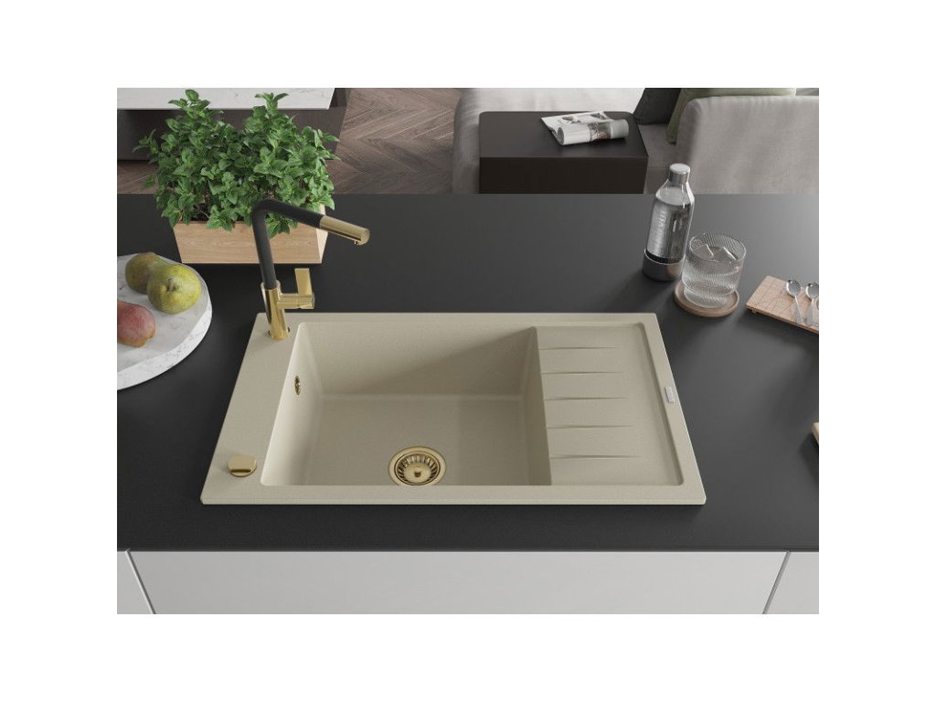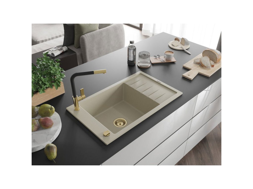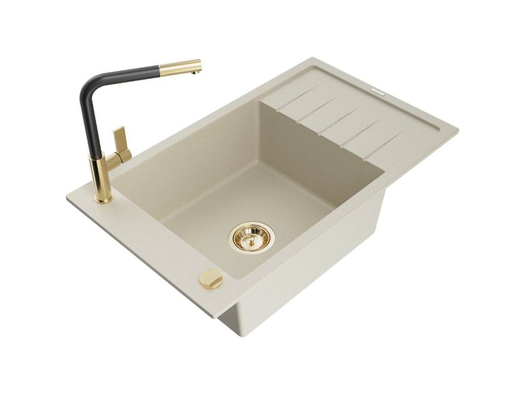 Granitový drez Mexen Elias s 1 misou, odkapávačom a batériou Flora, béžový - 6511-69-670401-57-G