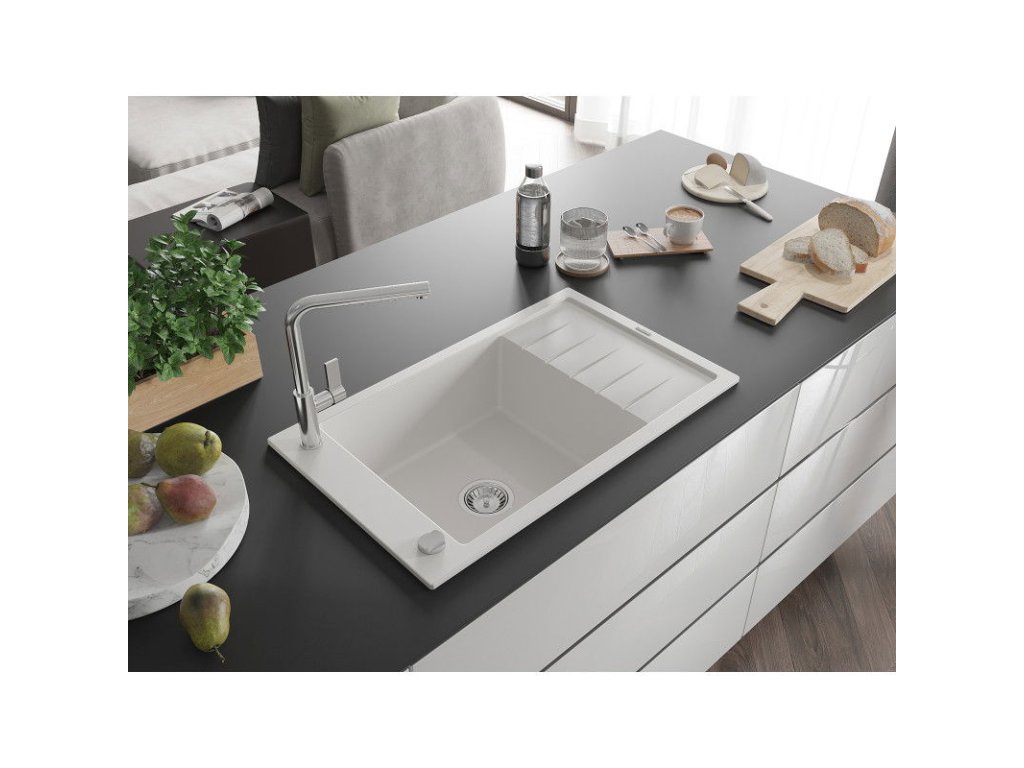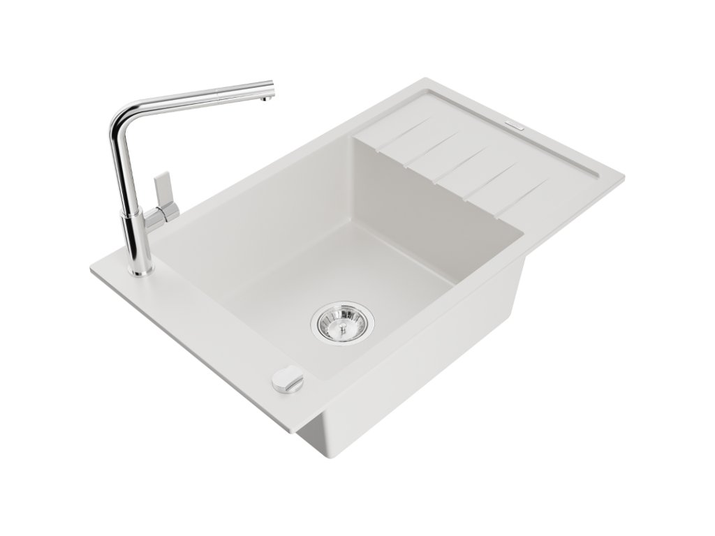 Granitový drez Mexen Elias s 1 misou, odkapávačom a batériou Flora, biely - 6511-20-670401-00