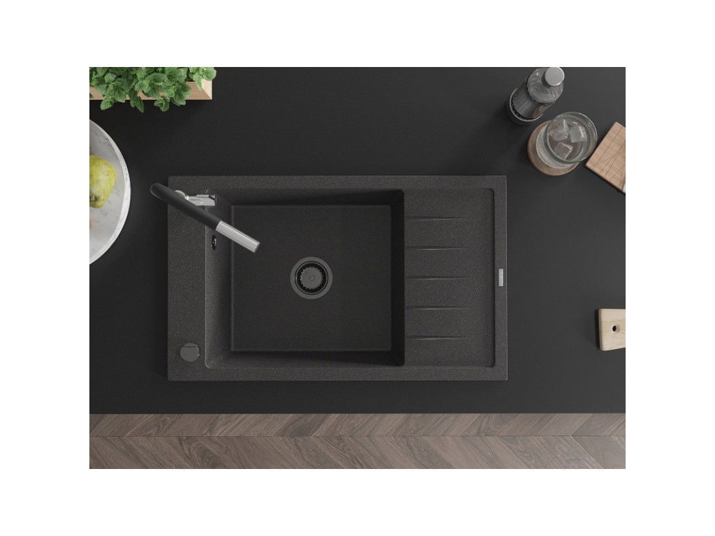 Granitový drez Mexen Elias s 1 misou, odkapávačom a batériou Flora, čierna škvrnitá - 6511-76-670401-07-B
