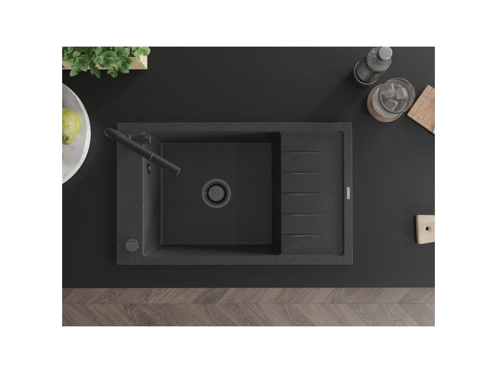 Granitový drez Mexen Elias s 1 misou, odkapávačom a batériou Flora, čierna škvrnitá - 6511-76-670401-70-B