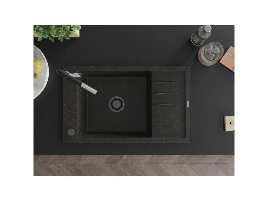 Granitový drez Mexen Elias s 1 misou, odkapávačom a batériou Flora, čierna/zlatá metalíza - 6511-75-670401-07-B