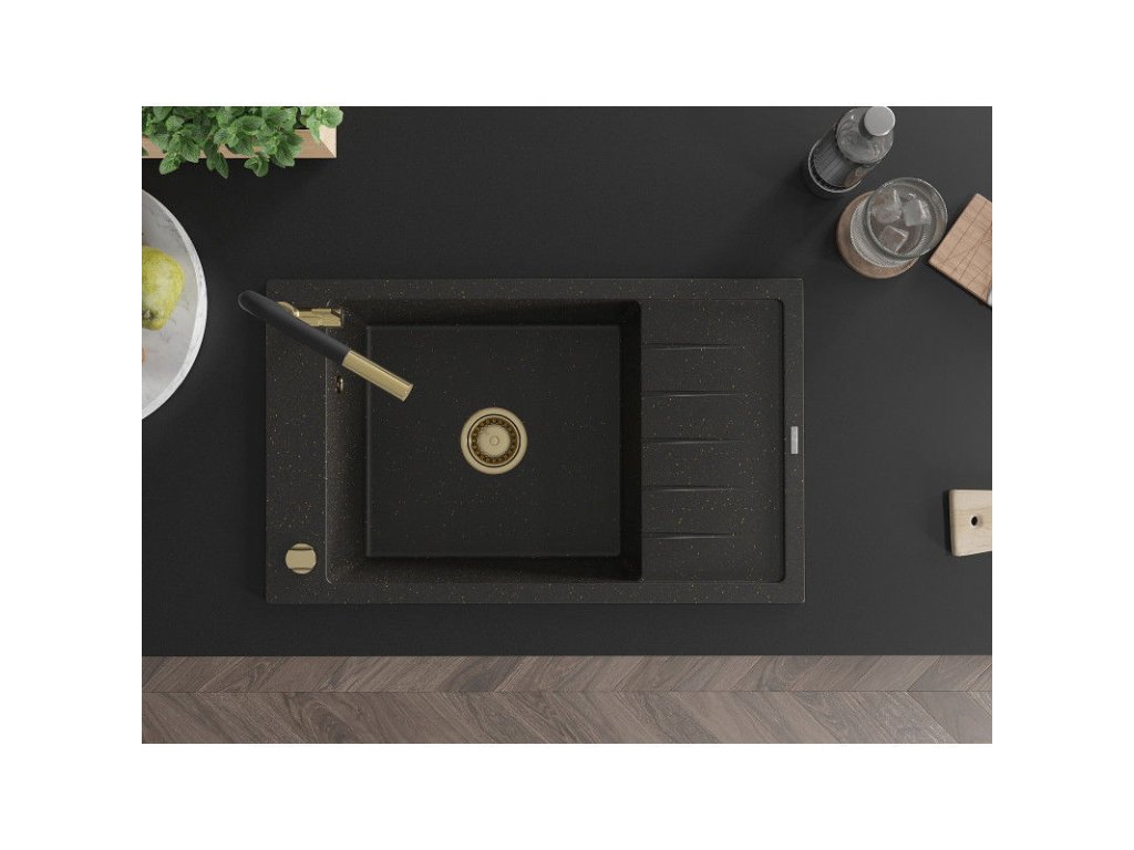 Granitový drez Mexen Elias s 1 misou, odkapávačom a batériou Flora, čierna/zlatá metalíza - 6511-75-670401-57-G