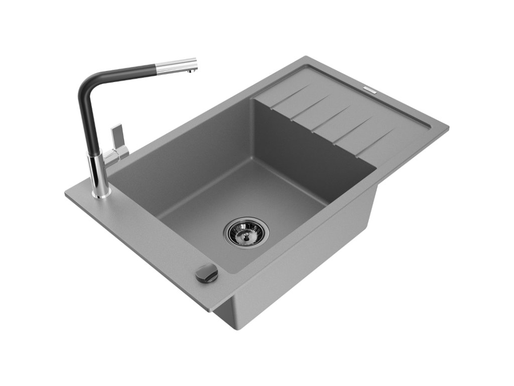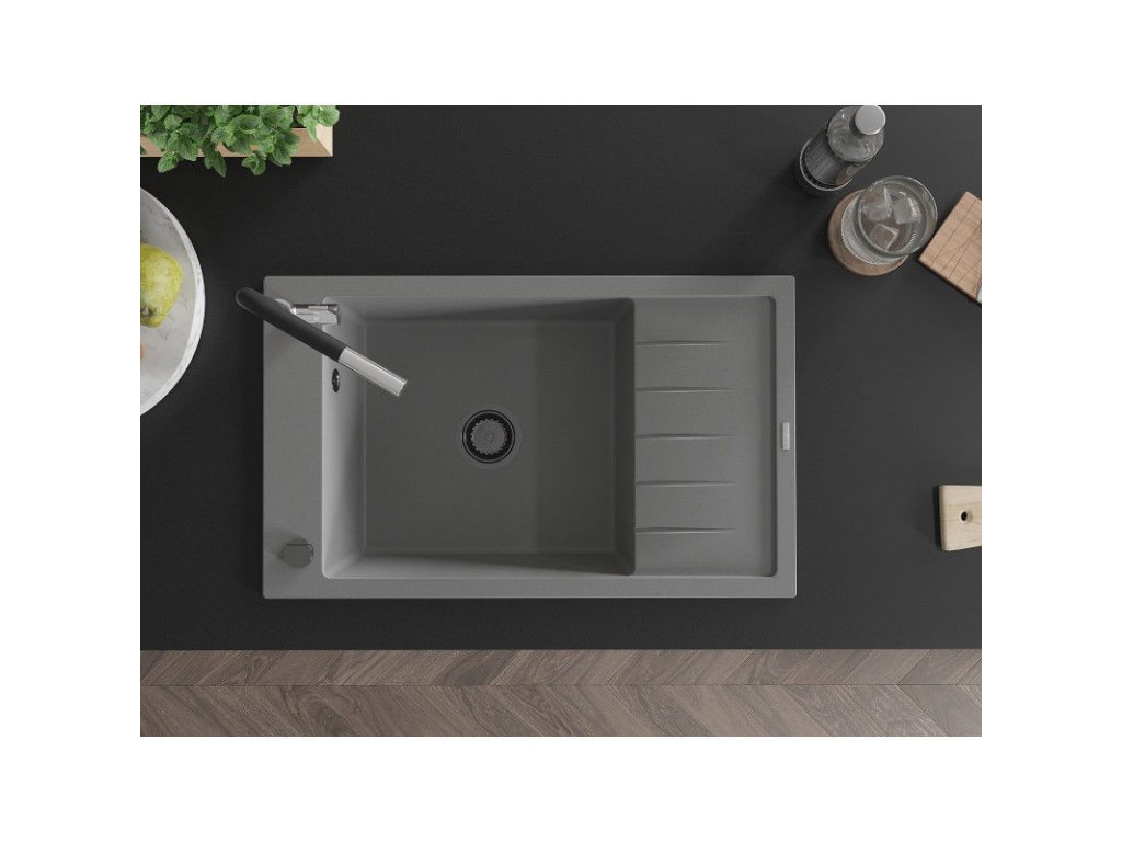 Granitový drez Mexen Elias s 1 misou, odkapávačom a batériou Flora, sivý - 6511-71-670401-07-B