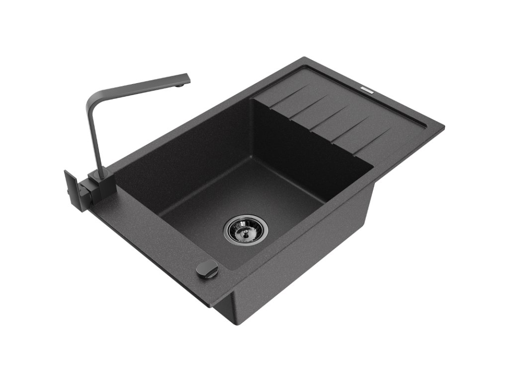 Granitový drez Mexen Elias s 1 misou, odkapávačom a batériou Rita, čierna škvrna - 6511-76-670300-70-B