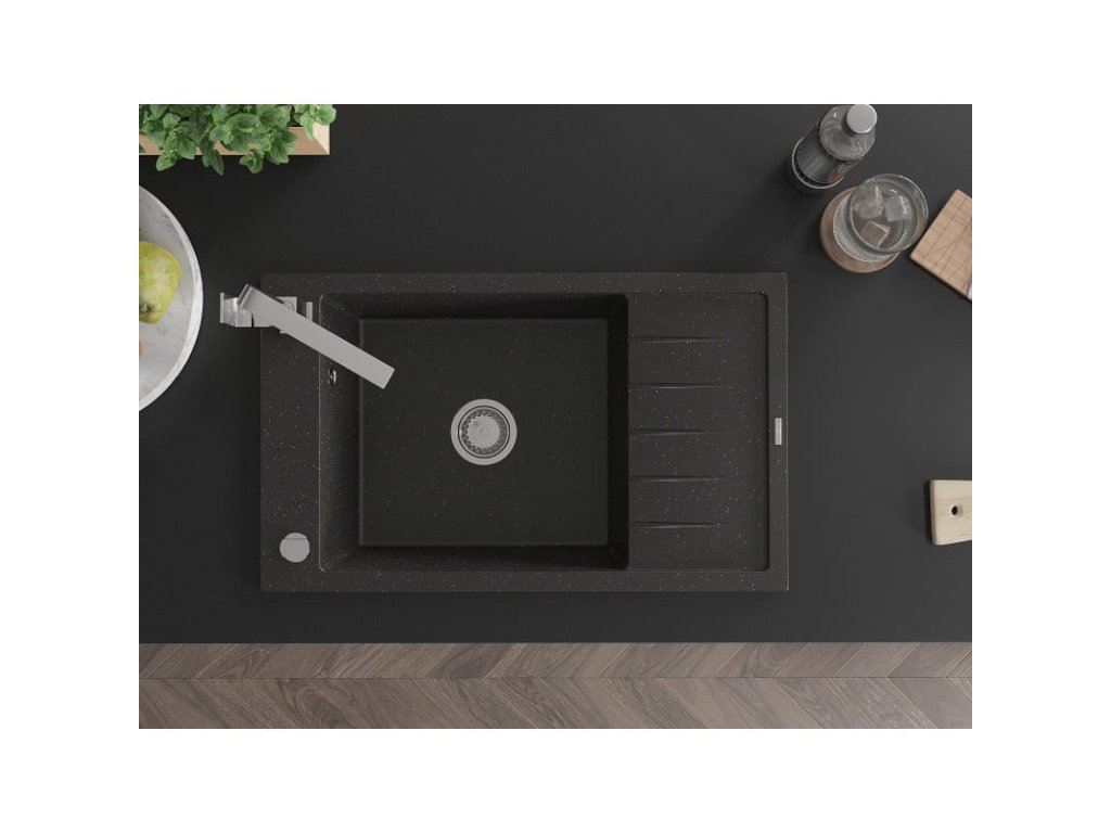 Granitový drez Mexen Elias s 1 misou, odkapávačom a batériou Rita, čierna/strieborná metalíza - 6511-73-670300-70