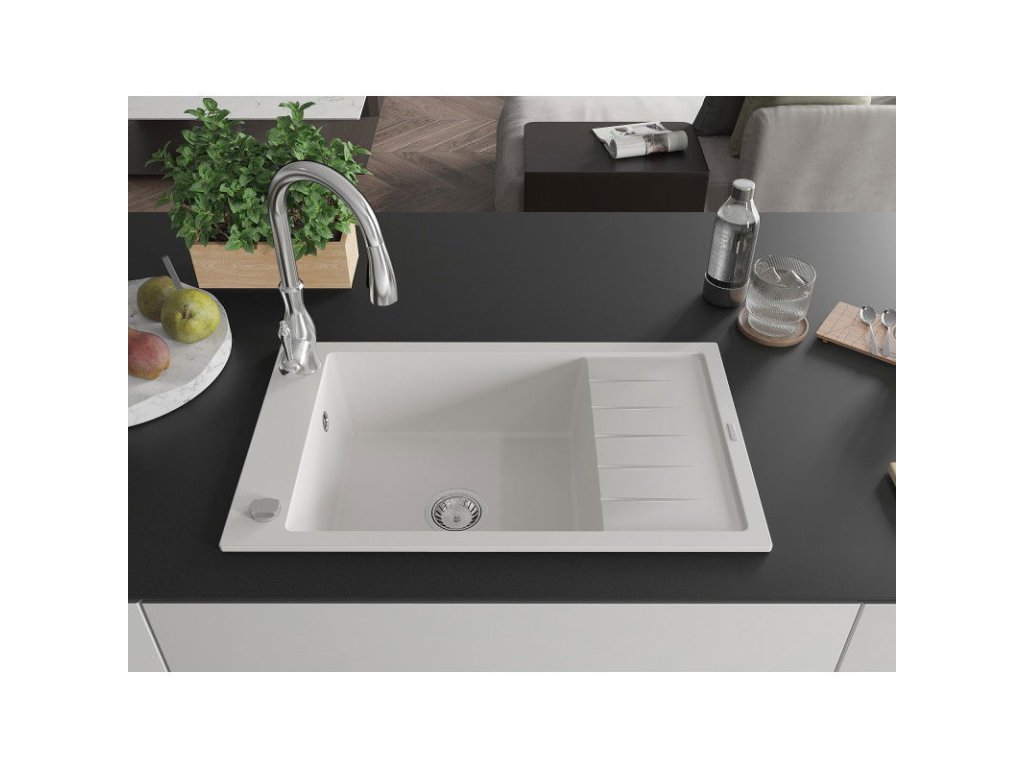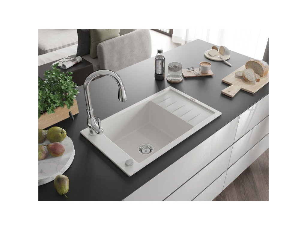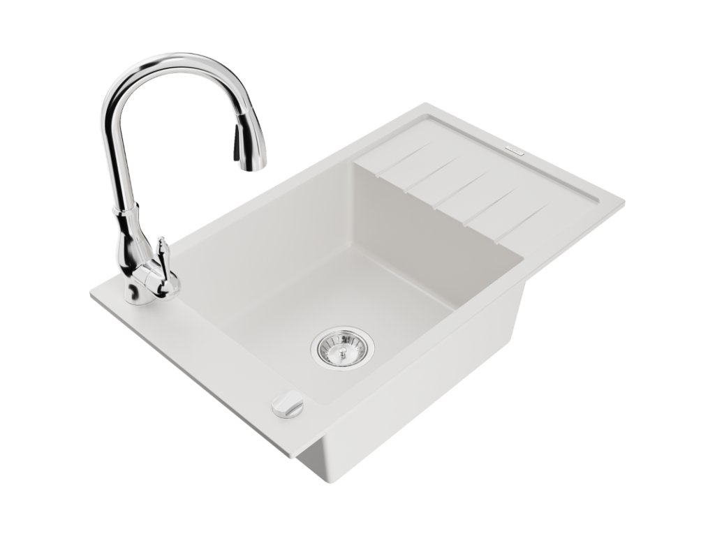 Granitový drez Mexen Elias s 1 misou, odkapávačom a batériou Savita, biely - 6511-20-672601-00