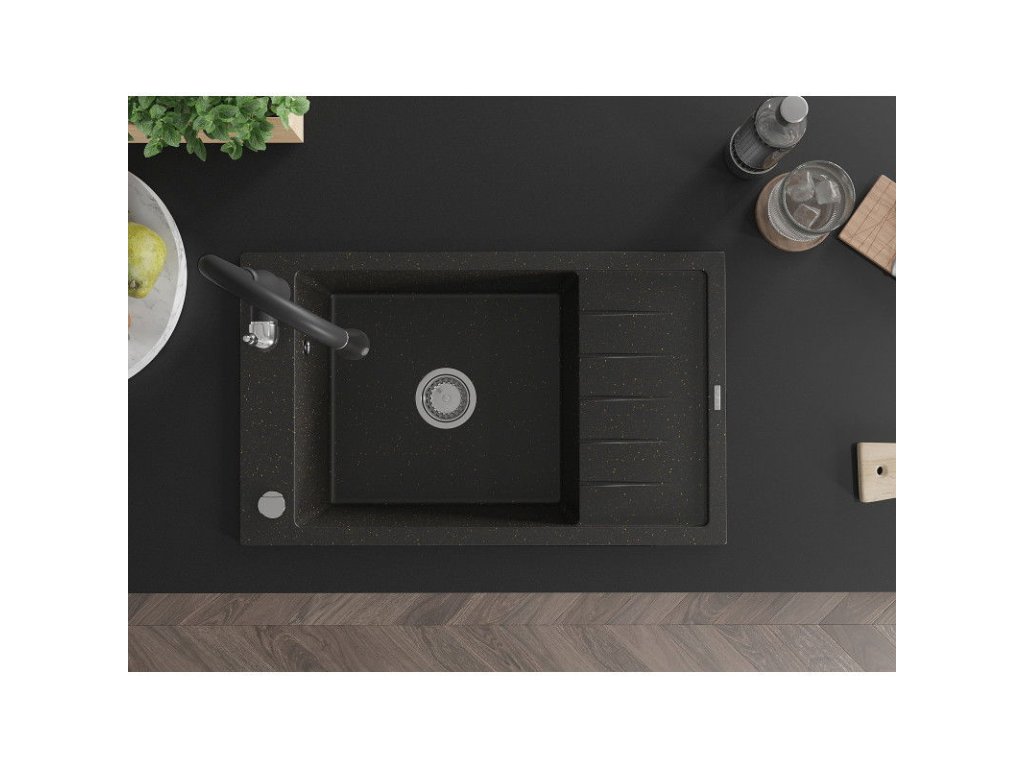 Granitový drez Mexen Elias s 1 misou, odkapávačom a batériou Savita, čierna/zlatá metalíza - 6511-75-672601-70