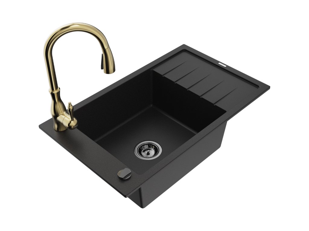 Granitový drez Mexen Elias s 1 misou, odkapávačom a batériou Savita, čierny - 6511-77-672601-50-B