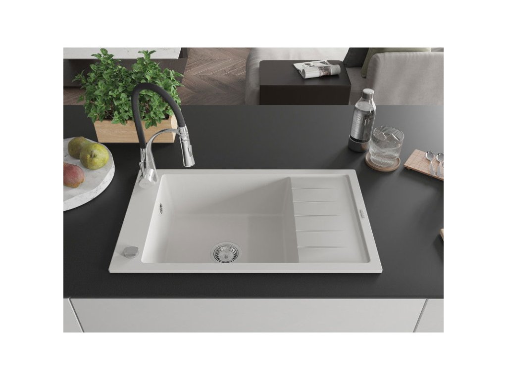 Granitový drez Mexen Elias s 1 misou, odkapávačom a kuchynskou batériou Aster, biely - 6511-20-73450-07