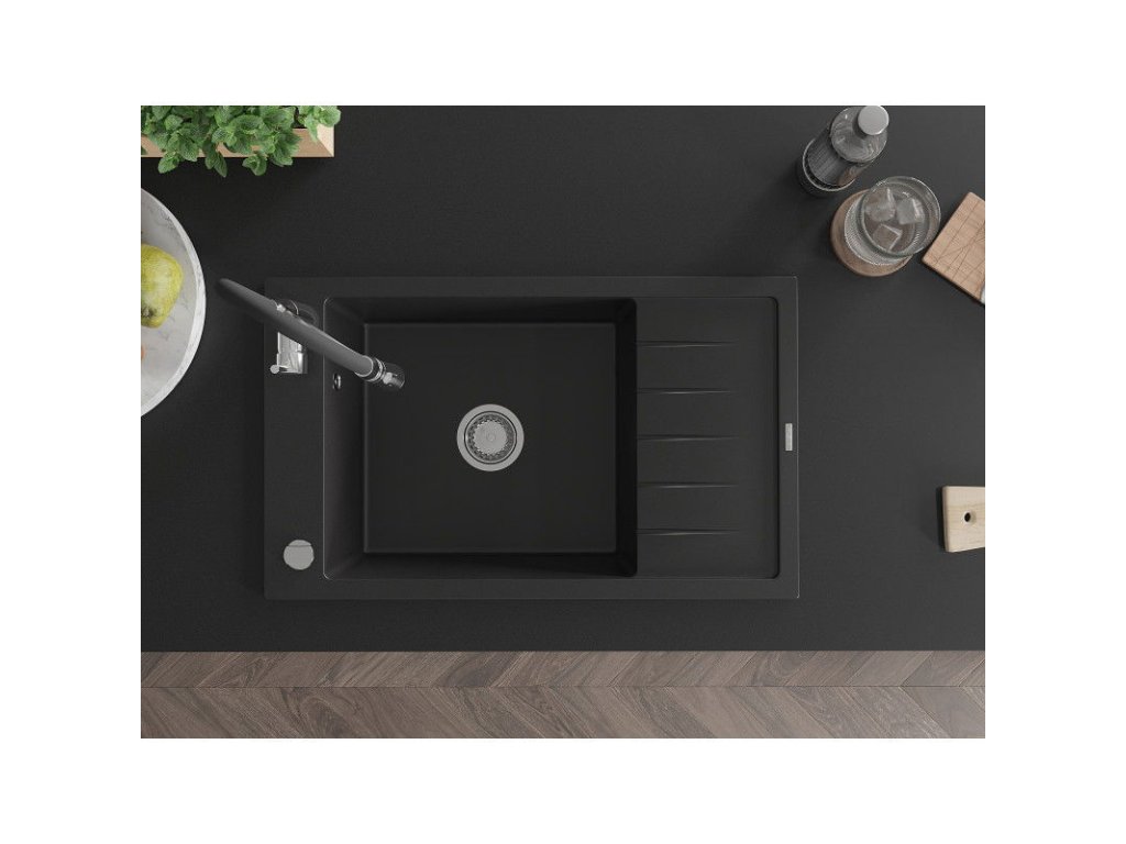 Granitový drez Mexen Elias s 1 misou, odkapávačom a kuchynskou batériou Aster, čierny - 6511-77-73450-07