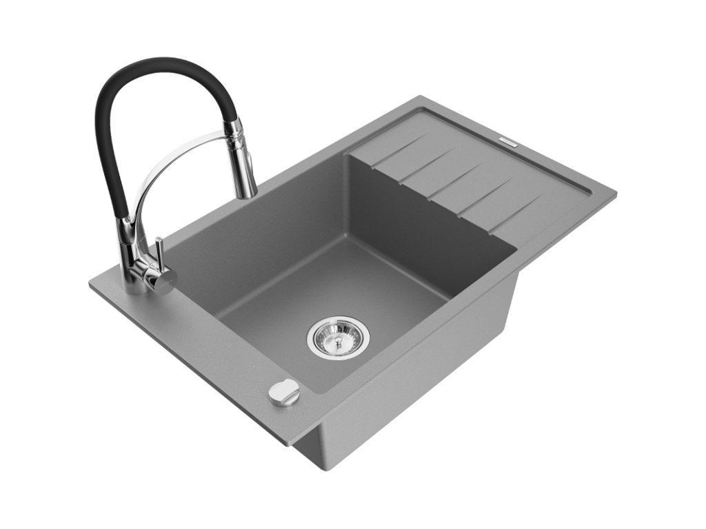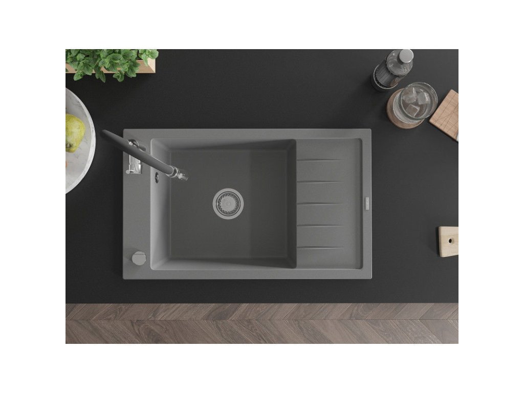 Granitový drez Mexen Elias s 1 misou, odkapávačom a kuchynskou batériou Aster, sivý - 6511-71-73450-07