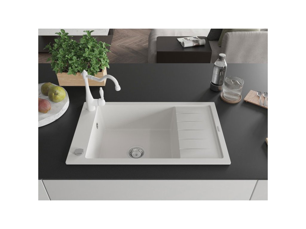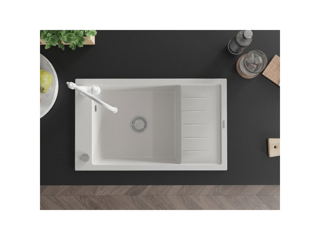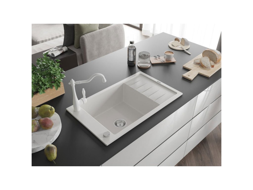 Granitový drez Mexen Elias s 1 misou, odkapávačom a kuchynskou batériou Carla, biely - 6511-20-670700-20