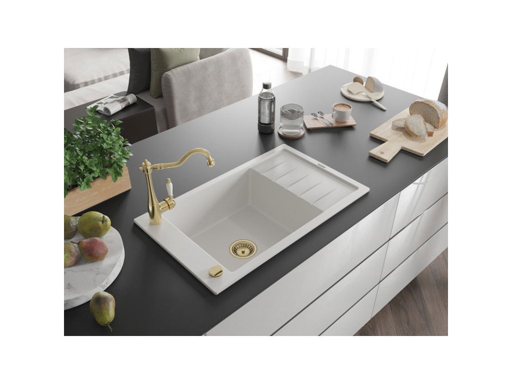 Granitový drez Mexen Elias s 1 misou, odkapávačom a kuchynskou batériou Carla, biely - 6511-20-670700-50