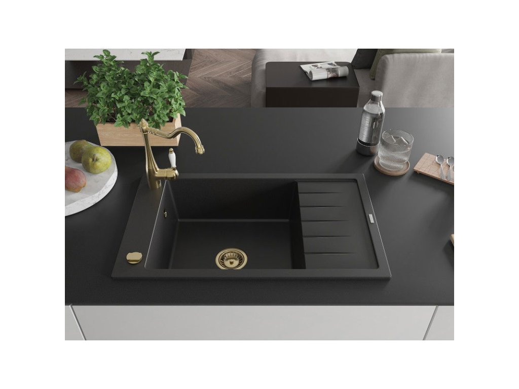 Granitový drez Mexen Elias s 1 misou, odkapávačom a kuchynskou batériou Carla, čierny - 6511-77-670700-50
