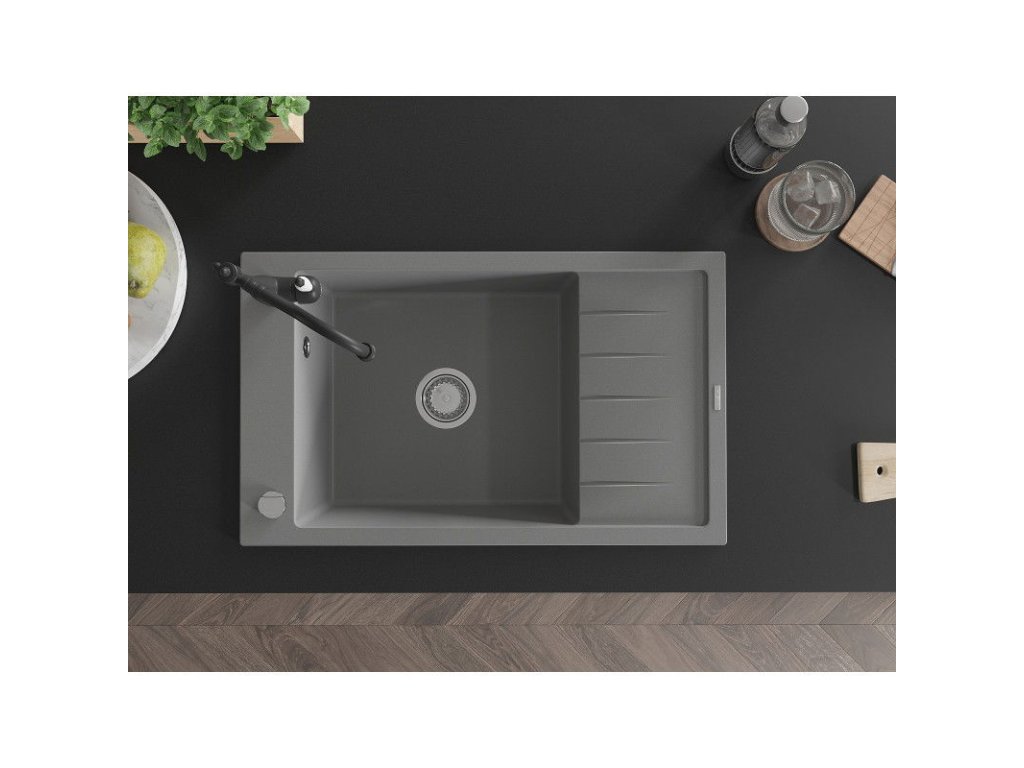 Granitový drez Mexen Elias s 1 misou, odkapávačom a kuchynskou batériou Carla, sivý - 6511-71-670700-70