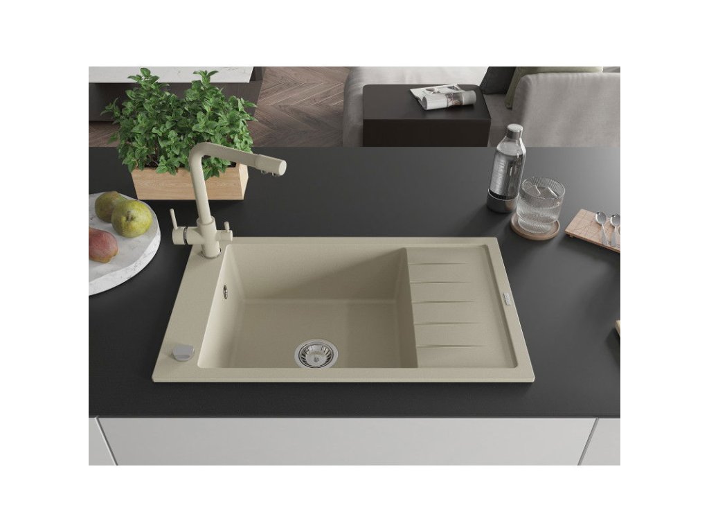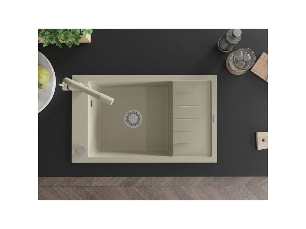 Granitový drez Mexen Elias s 1 misou, odkapávačom a kuchynskou batériou Duero, béžový - 6511-69-671600-69