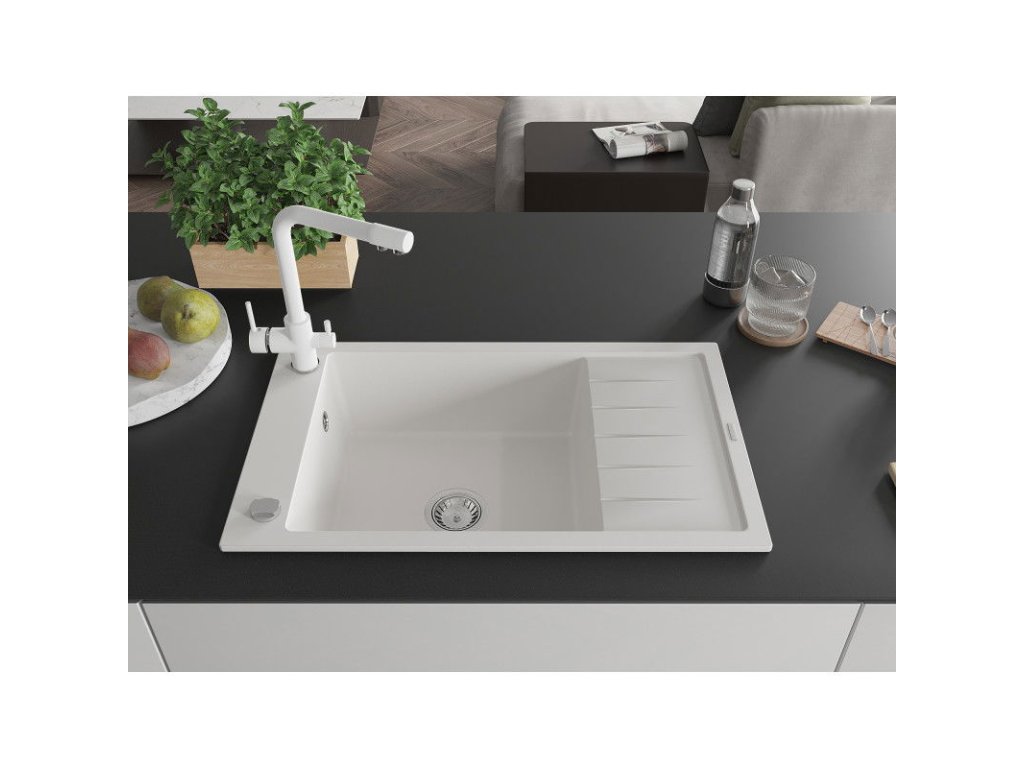 Granitový drez Mexen Elias s 1 misou, odkapávačom a kuchynskou batériou Duero, biely - 6511-20-671600-20
