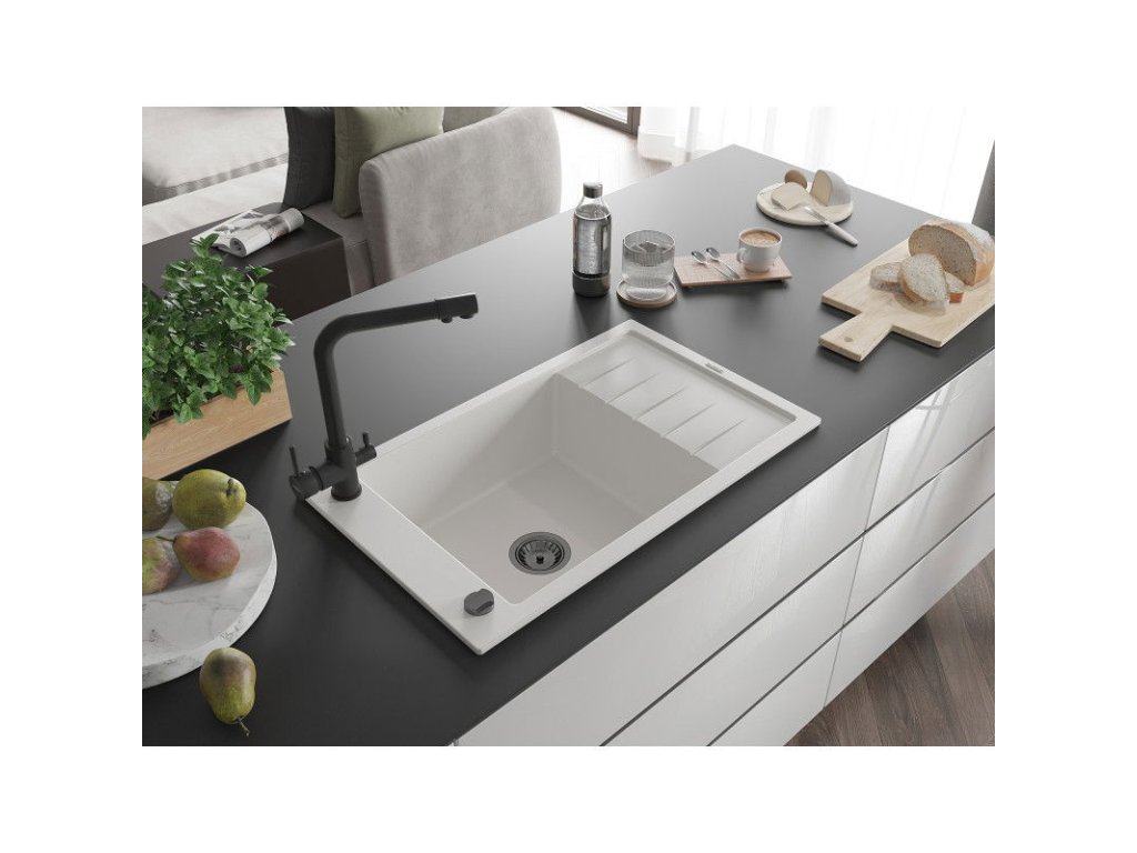 Granitový drez Mexen Elias s 1 misou, odkapávačom a kuchynskou batériou Duero, biely - 6511-20-671600-70