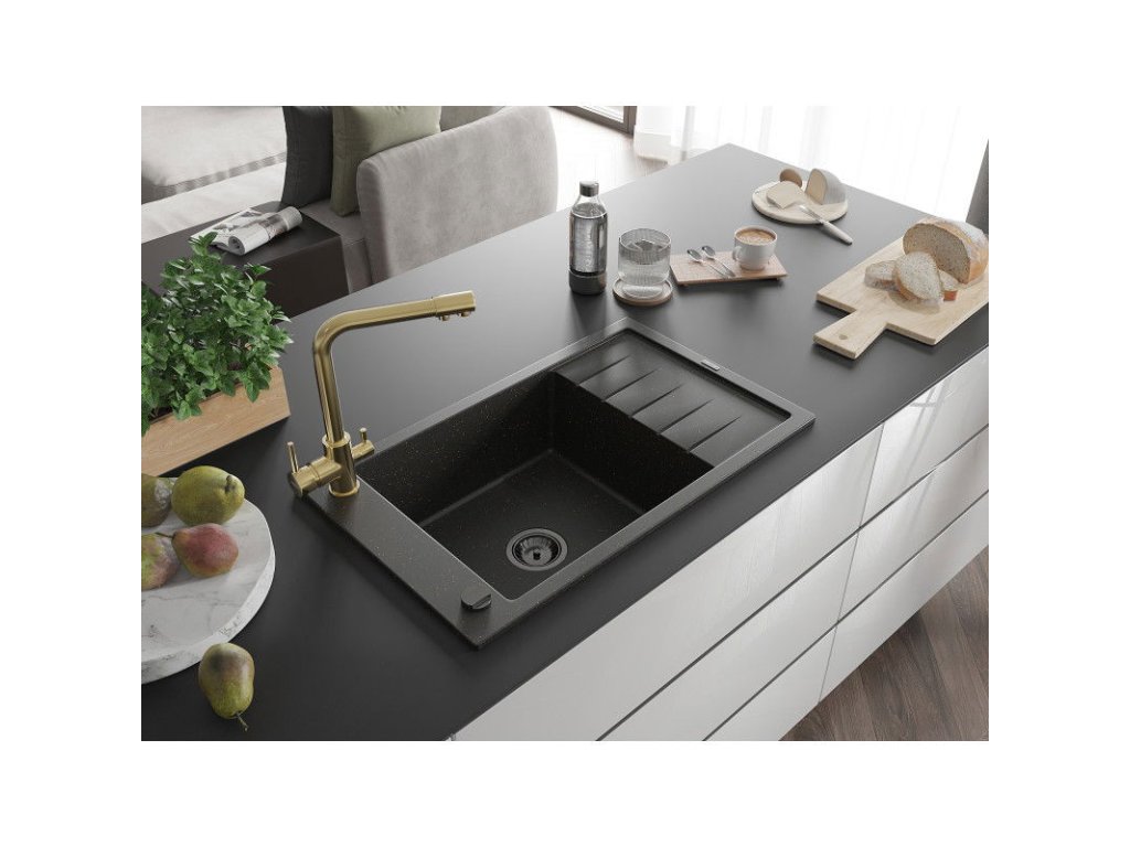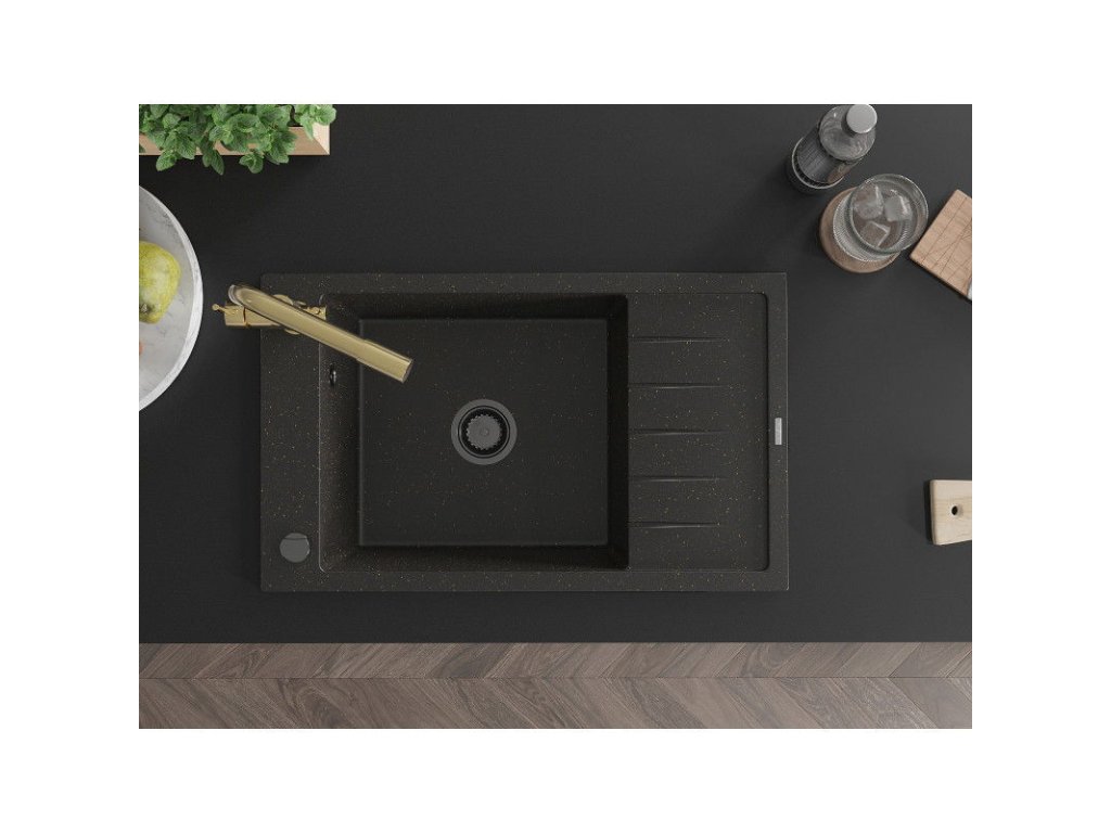 Granitový drez Mexen Elias s 1 misou, odkapávačom a kuchynskou batériou Duero, čierna/zlatá metalíza - 6511-75-671600-50-B