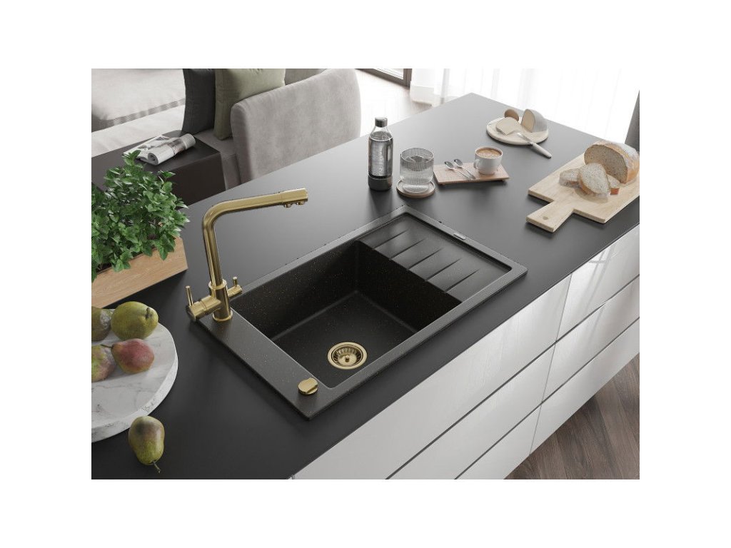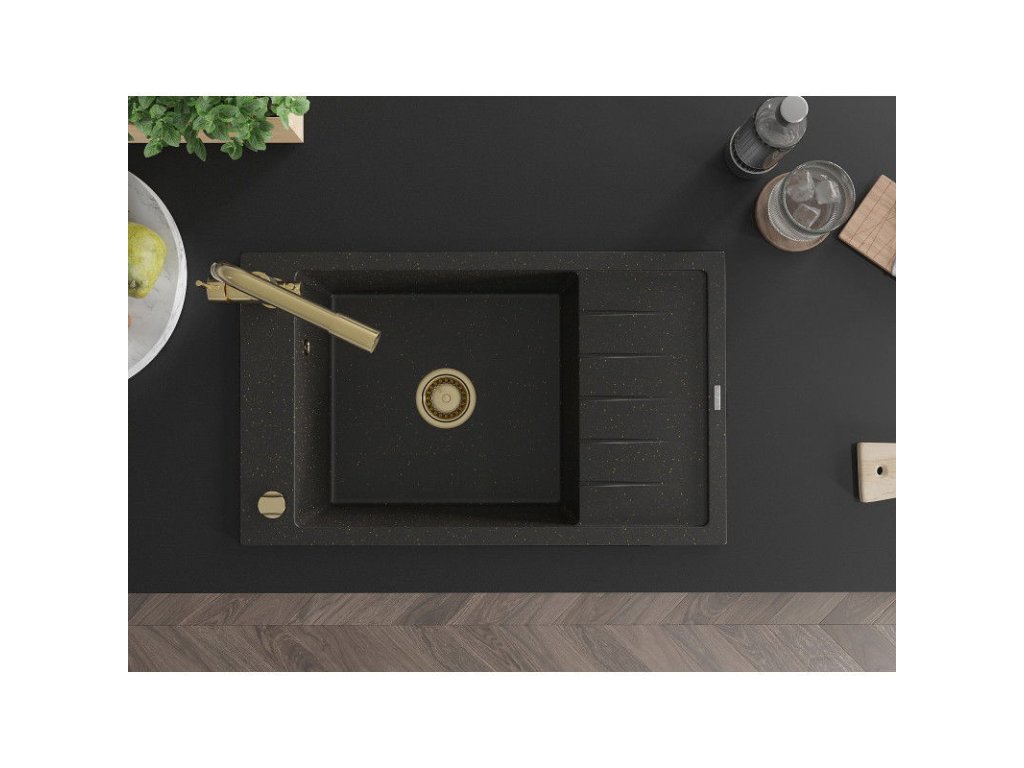Granitový drez Mexen Elias s 1 misou, odkapávačom a kuchynskou batériou Duero, čierna/zlatá metalíza - 6511-75-671600-50