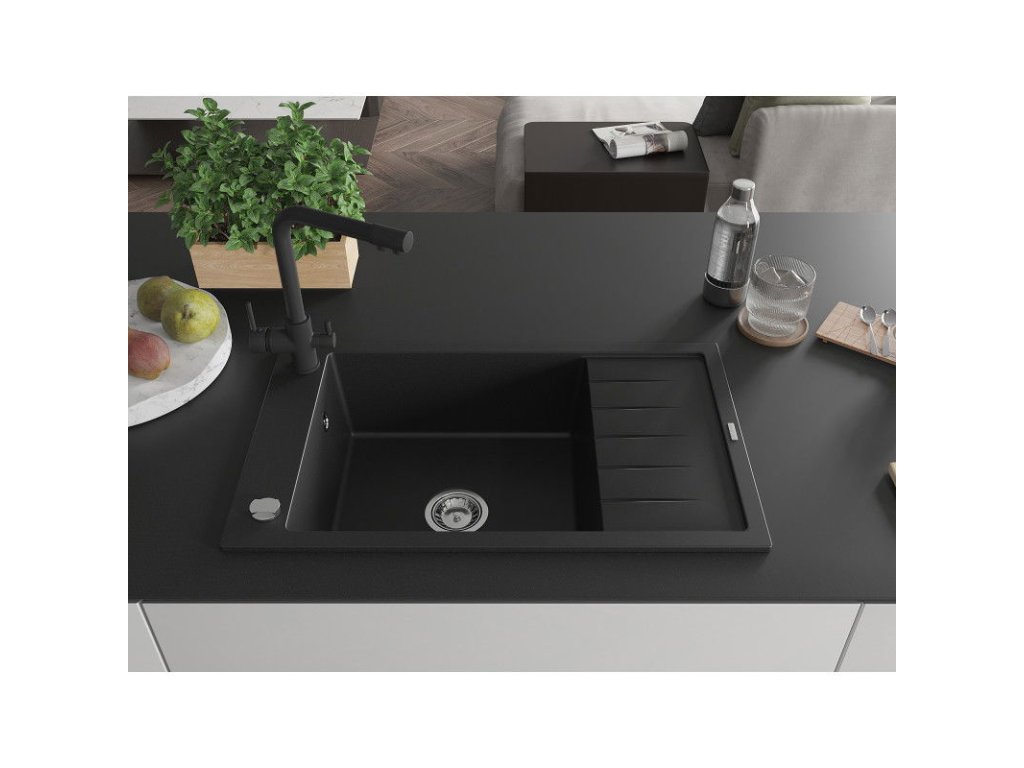 Granitový drez Mexen Elias s 1 misou, odkapávačom a kuchynskou batériou Duero, čierny - 6511-77-671600-70