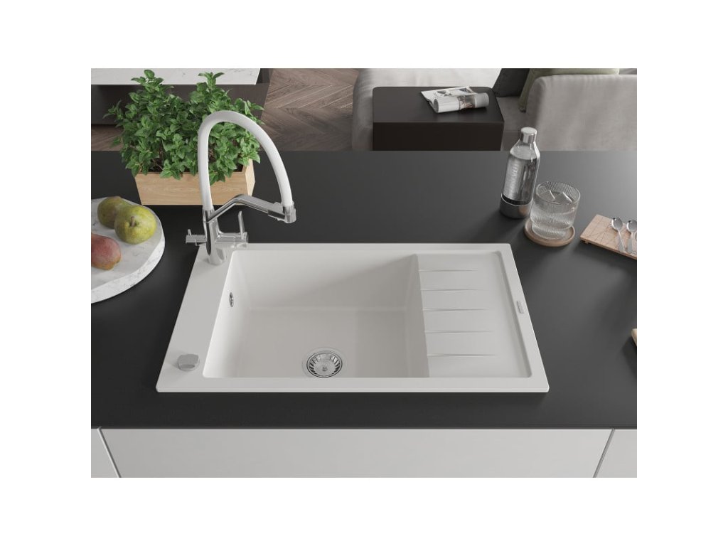 Granitový drez Mexen Elias s 1 misou, odkapávačom a kuchynskou batériou Duo, biely - 6511-20-671701-02