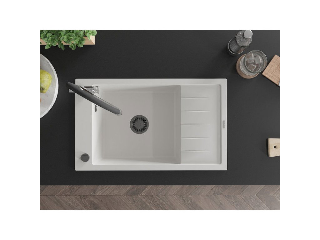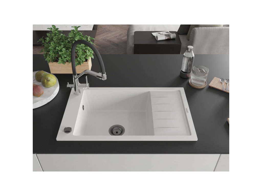 Granitový drez Mexen Elias s 1 misou, odkapávačom a kuchynskou batériou Duo, biely - 6511-20-671701-07-B