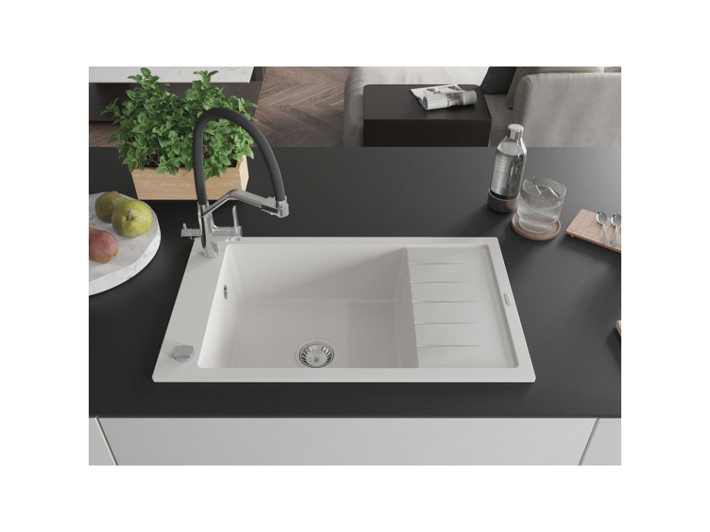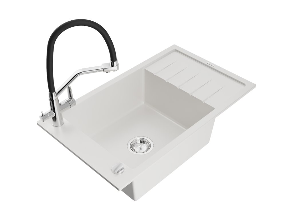 Granitový drez Mexen Elias s 1 misou, odkapávačom a kuchynskou batériou Duo, biely - 6511-20-671701-07