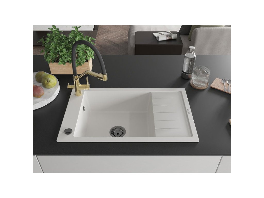 Granitový drez Mexen Elias s 1 misou, odkapávačom a kuchynskou batériou Duo, biely - 6511-20-671701-57-B