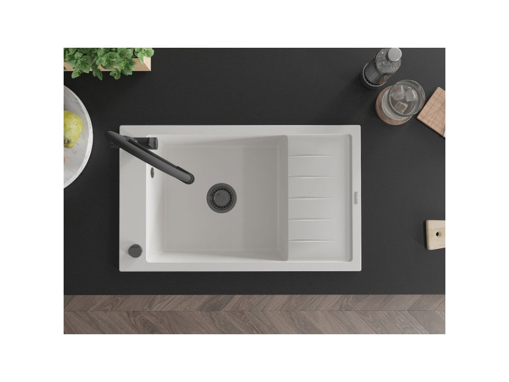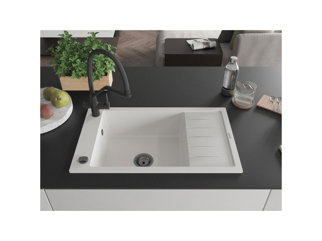 Granitový drez Mexen Elias s 1 misou, odkapávačom a kuchynskou batériou Duo, biely - 6511-20-671701-70-B