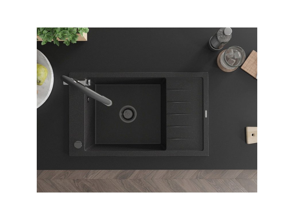 Granitový drez Mexen Elias s 1 misou, odkapávačom a kuchynskou batériou Duo, čierna/strieborná metalíza - 6511-73-671701-07-B