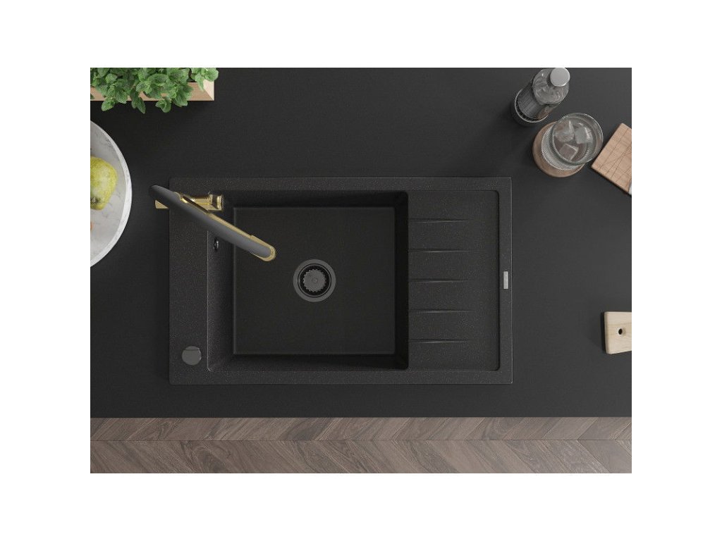 Granitový drez Mexen Elias s 1 misou, odkapávačom a kuchynskou batériou Duo, čierna/strieborná metalíza - 6511-73-671701-57-B