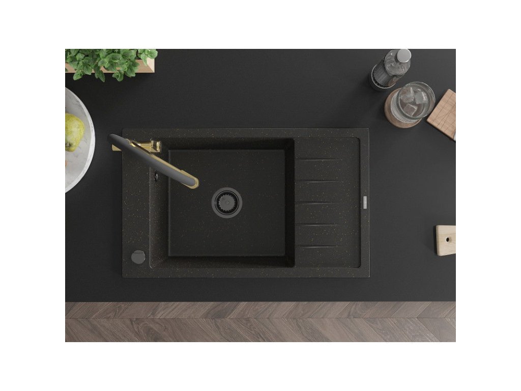 Granitový drez Mexen Elias s 1 misou, odkapávačom a kuchynskou batériou Duo, čierna/zlatá metalíza - 6511-75-671701-57-B